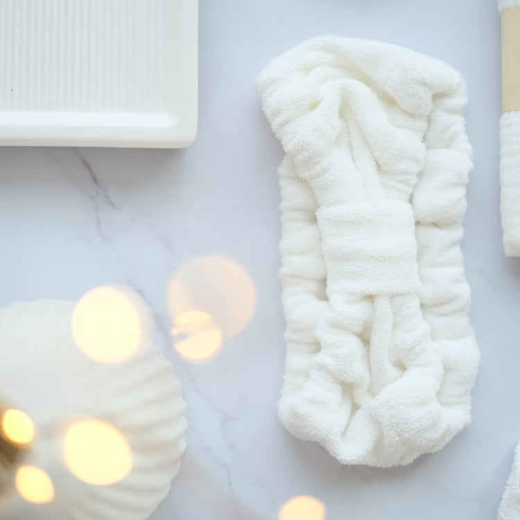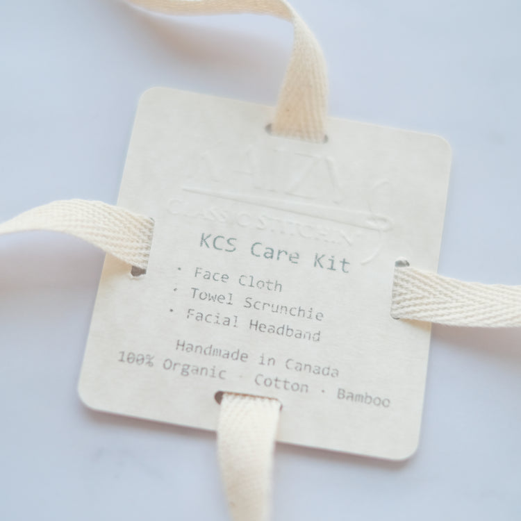 Elevate your skincare routine with our KCS Care Kit. Our carefully curated selection of high-quality products includes a plush face cloth, a chic towel scrunchie and a facial headband.